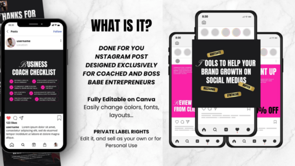 Looking to kickstart your digital product business? Check out our Boss Babe Instagram Post Templates in chic pink and black!